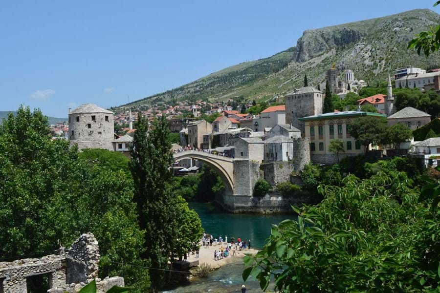 Door naar Mostar, wat buiten die toeristische vierkante meters van de Stari Most een gewone stad is. Vanaf een terras boven onze camperplaats krijgen we een privéblik op de Stari Most, de beroemde Oude Brug, barstensvol toeristen. De springers zijn er ook: de mannen en vrouwen die vanaf de negentien meter hoge brug in de rivier de Neretva springen. De iconische brug werd verwoest in 1993 tijdens de Balkanoorlog, is weer opgebouwd onder supervisie van de Unesco en heropend in 2004. Wat we nu zien is dus een kopie. Eromheen is die typisch oosterse bebouwing en al snel tellen we zes minaretten, potloden zoals mijn lief ze noemt. Wat klinkt de eerste oproep tot gebed magisch in onze oren. De drukte en hitte zijn echter zo overweldigend, dat we pas ’s avonds over die lastige kasseitjes de brug op gaan. Het is een wirwar van steegjes, moskeeën, kerken, restaurantjes en winkeltjes. Een keer is echt genoeg, maar eerlijk: een lust voor oog en oor.