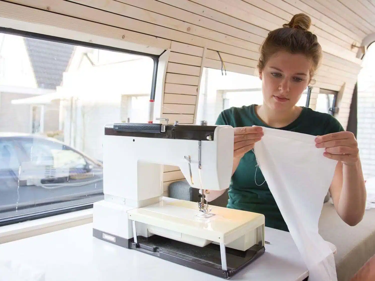 De vitrage maken we van een goedkoop Ikea gordijn (10 euro). Dat knippen we in de juiste maten en zoomen we om met de naaimachine. In plaats van een rails gebruiken we een stuk touw, dat we door de tunnel van de gordijnen halen. De bandjes om ze vast te knopen maken we van leer dat we op de lapjesmarkt konden krijgen. Zo blijft alles tijdens het rijden op z’n plek.