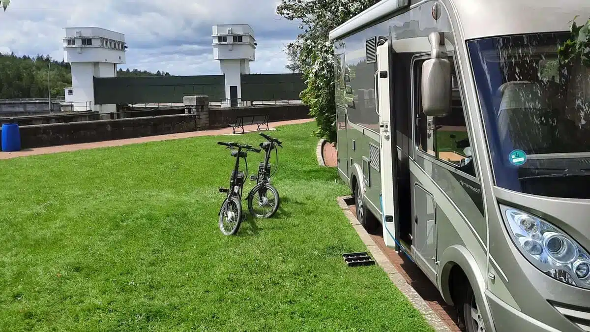 Het is hier stil en ‘s nachts pikdonker. We ontwaken in dikke mist, zelfs de nabije hoge uitkijktoren is onzichtbaar. Naar beneden rijdend zien we de wereld gelukkig weer tot leven komen. We stoppen bij de enorme stuw in Eupen in België, fietsen vijftien kilometer rond het meer en ontdekken ook nog weetjes op de panelen langs het bosleerpad. De Vesderdam is een gigantische wand, het stuwmeer wordt gevuld door de rivieren de Vesder en de Getzbach.