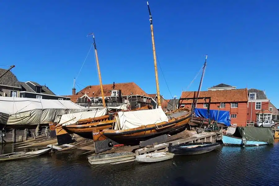 Van hieruit fietsen we naar het Nautisch Kwartier met fraaie houten panden. We zien op de botterwerf een paar mensen bezig met het smeden van ijzer. We kunnen letterlijk en figuurlijk niet om de Ark van Noach heen. Die is maar liefst 70 m lang en 10 m breed. Dit museum neemt je mee langs een scala van Bijbelverhalen tot het Nieuwe Testament. Inmiddels is dit varende museum verder getrokken naar Zeewolde. In deze gemeente is de ark de komende jaren te bezoeken.
