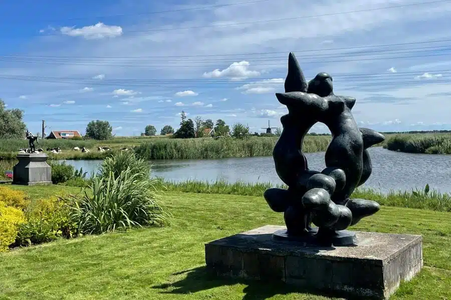 Als we rondlopen, zien we ook beelden die iets vertellen over hedendaagse thema’s zoals afval, de gaswinning en het wankele evenwicht tussen mens en natuur. Dat hebben we inderdaad niet gezien bij de andere beeldentuinen.