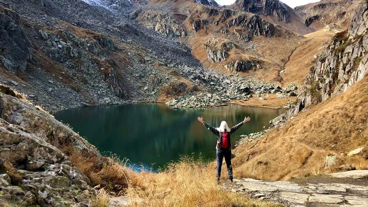 Dan begint de wandeling naar het Lai da Tuma, dat op 2.343 meter hoogte ligt. Het eerste deel is een makkelijk pad, maar allengs wordt het steiler en komt er ook meer handen-en-voetenwerk bij te pas. Geregeld stappen we over of door het Rijnwater en we zijn blij met onze waterdichte schoenen. In een kleine twee uur bereiken we dan het meer en voelen een soort van euforie: hebben we het hier allemaal voor gedaan?